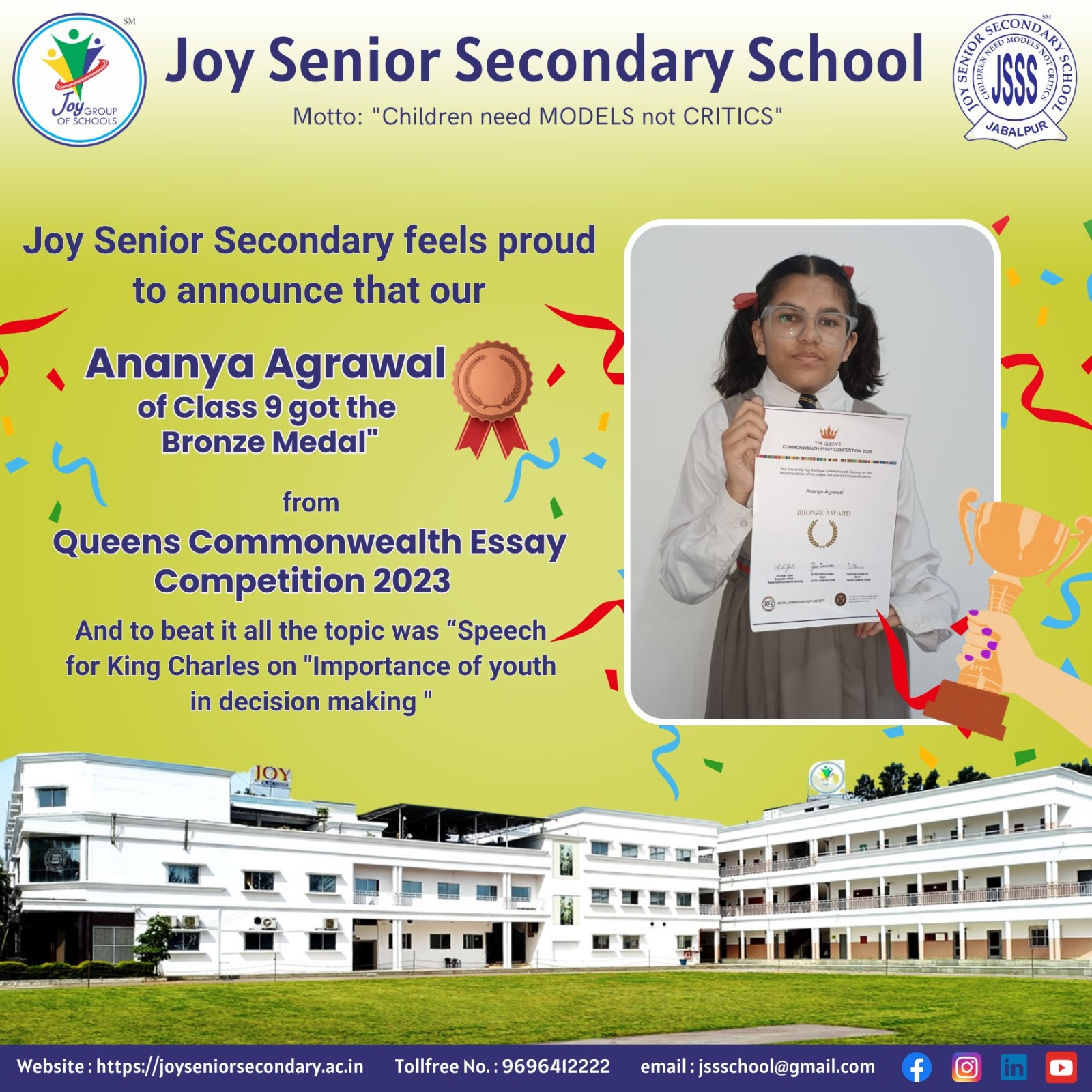 It is indeed a proud moment for Joy Senior Secondary School, when Ms.Ananya Agrawal of Class IX bagged a Bronze Award in THE QUEEN’S COMMONWEALTH ESSAY COMPETITION (QCEC) 2023 conducted by the Royal Commonwealth Society, London,thus adding another golden feather to our cap.We congratulate her and wish her all the best for her future endeavours.