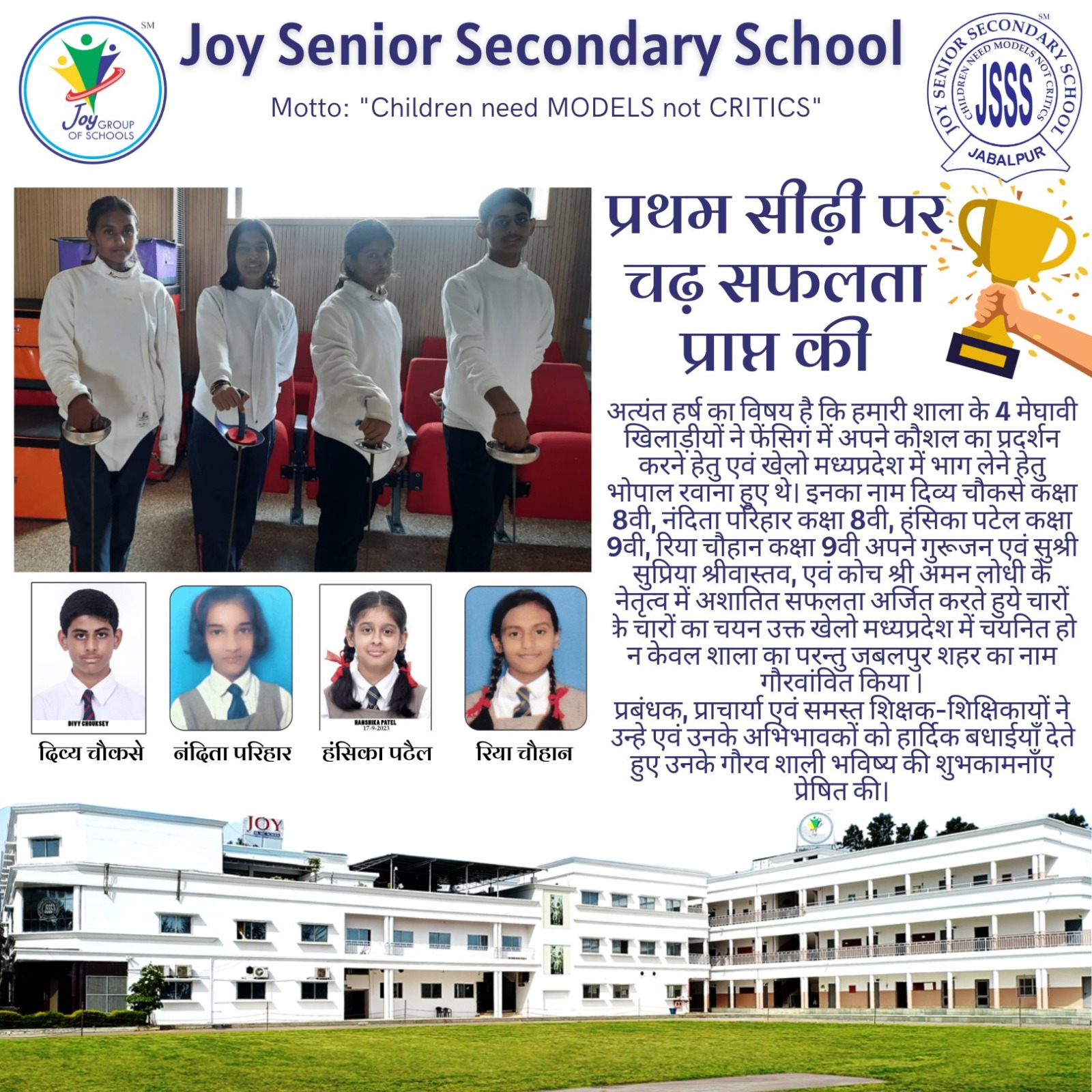 Joy Senior Secondary School, Jabalpur, proudly announces that Yatharth Dubey (Class 10) and Hanshika Patel (Class 11) have qualified for the Under-17 National Fencing Championship after their stellar performance at the State-Level Selection Trials held in Bhopal on August 28, 2025. Their hard work and dedication have brought pride to the school, and the entire Joyian family wishes them great success at the nationals in Haldwani, Uttarakhand.